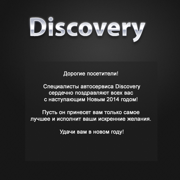 Дорогие посетители! Специалисты автосервиса "Discovery" сердечно поздравляют всех Вас с наступающим Новым 2014 годом! Пусть он принесет Вам только самое лучшее и исполнит Ваши искренние желания. Удачи Вам в новом году!